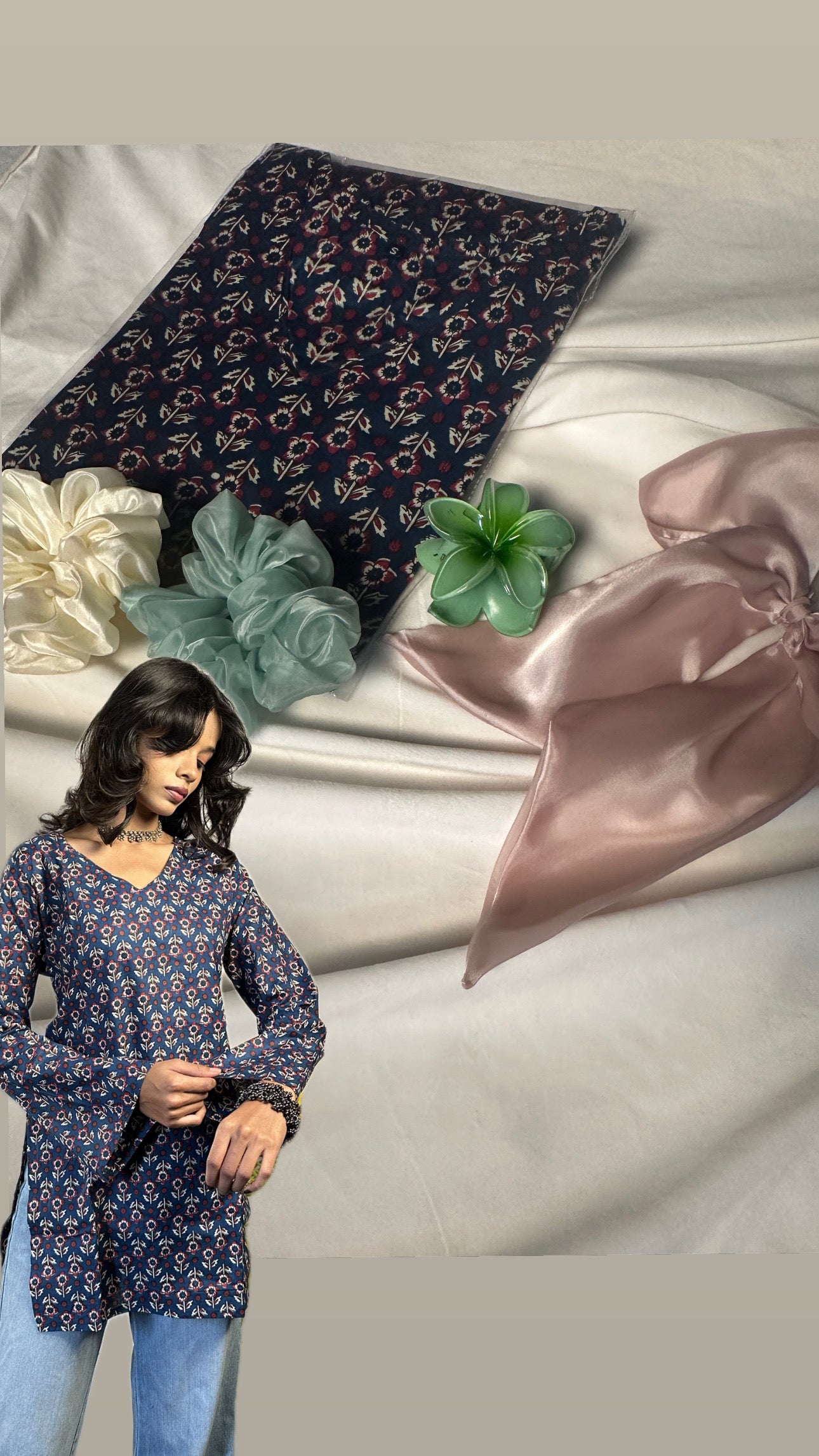 This curated fashion combo brings together a premium cotton printed kurti for women with matching hair accessories to complete the look effortlessly.