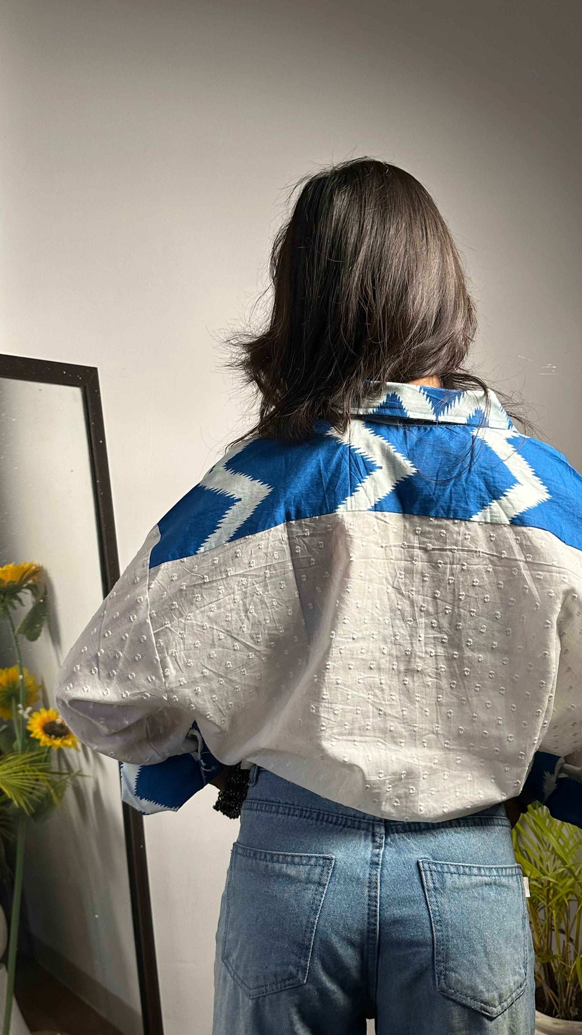 Snazzybees' white cotton shirt upgraded with desi-style Zigzag print on the collar, cuffs, and pocket, perfect for those who love minimal yet standout fashion. This unisex piece blends comfort and culture effortlessly.