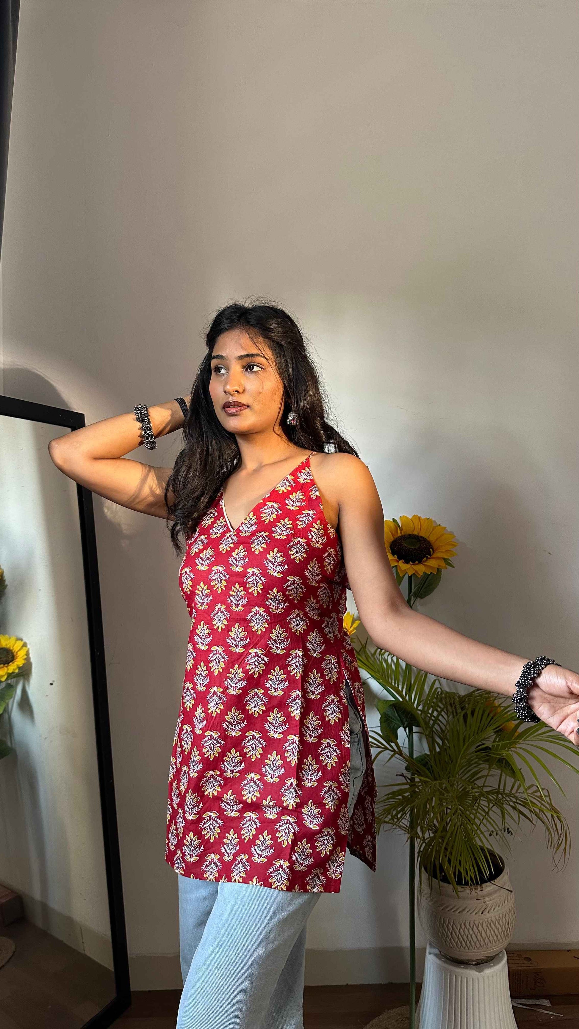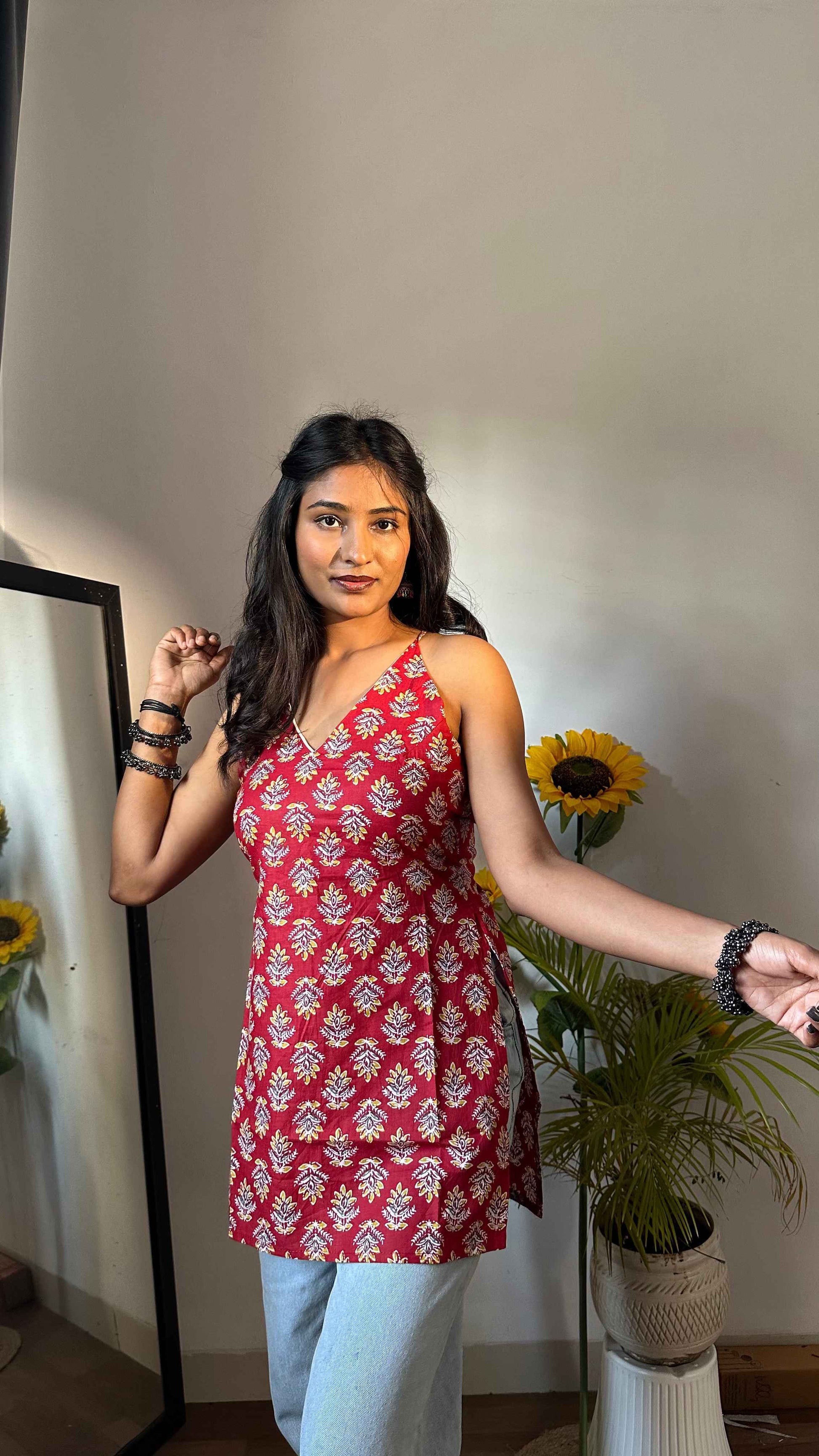 Snazzybees Printed Cotton Backless Short Kurti blends desi prints with a modern, youth-friendly silhouette, giving you the perfect mix of comfort and confidence.